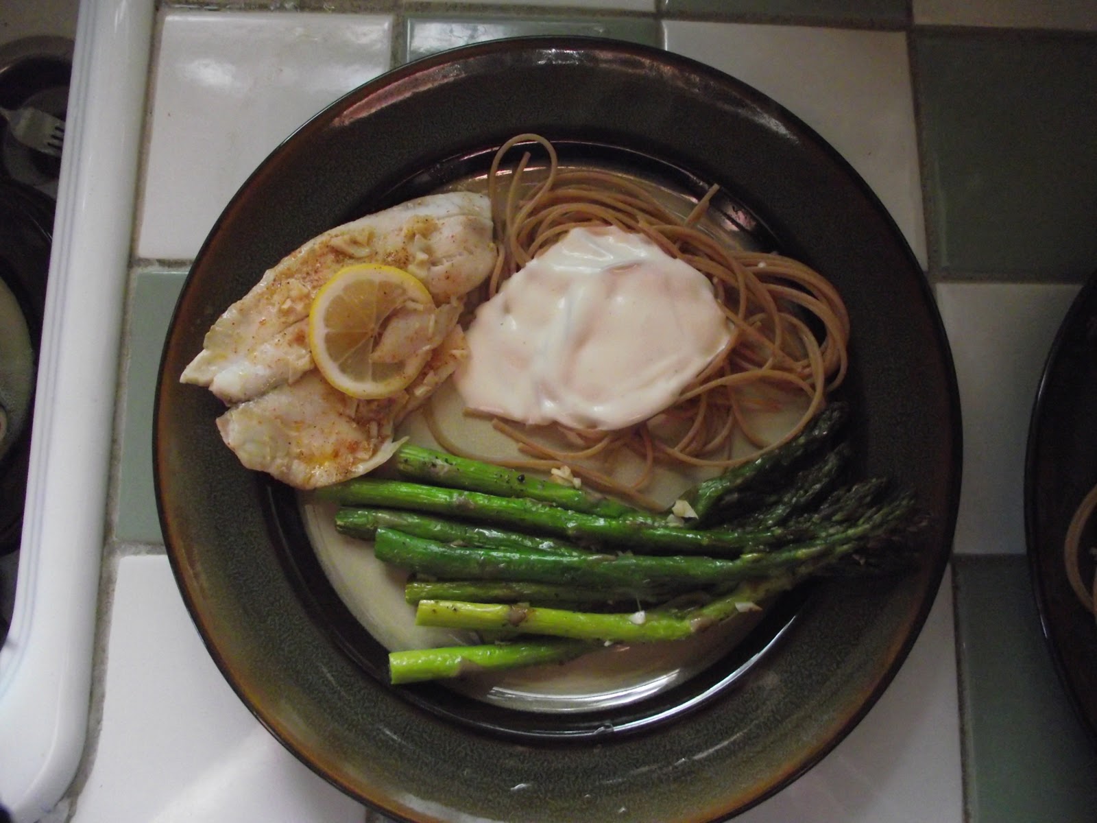 Grilled Tilapia, Roasted Asparagus, Whole Wheat Noodles, and a Cream Sauce |
